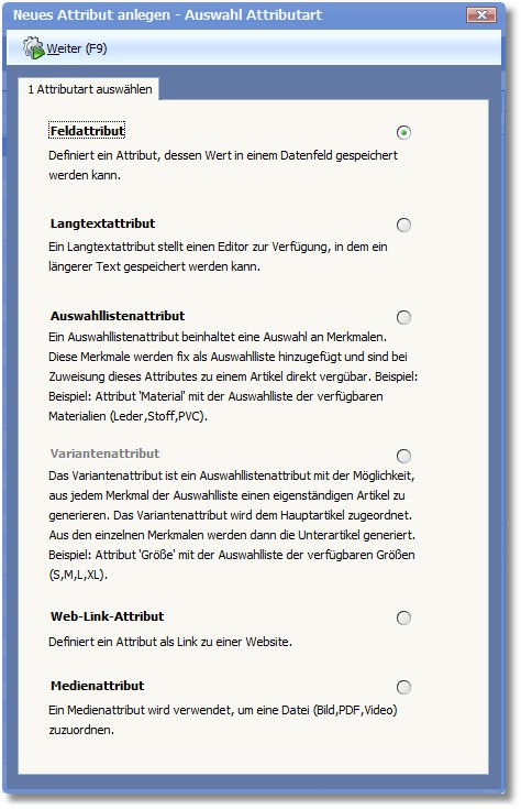 Wählen Sie hier die zutreffende Attributart aus und klicken Sie auf <Weiter> bzw. drücken Sie [F9].