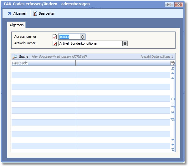 Navigation:  Warenwirtschaft > Stammdaten > Konditionen > Adress/Artikel > Adress/Artikel bearbeiten - Menüleiste >