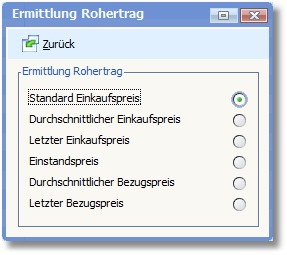 Legen Sie in dieser Maske durch Aktivierung des entsprechenden Radiobuttons fest, welcher Wert für die Ermittlung des Rohertrags einer Position in der Auftragsbearbeitung herangezogen werden soll.