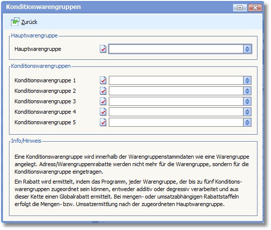 << Hier KLicken um eine Inhaltsübersicht anzuzeigen >> Navigation: Warenwirtschaft > Stammdaten > Artikelstamm > Artikelstamm - Menü > Warengruppen > Die Karteikarte "Standard" > Konditionswarengruppen |
