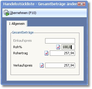 << Hier KLicken um eine Inhaltsübersicht anzuzeigen >> Navigation: Warenwirtschaft > Stammdaten > Handelsstücklisten > Handelsstücklisten anlegen und ändern > Gesamtbetrag der Handelsstückliste ändern |
