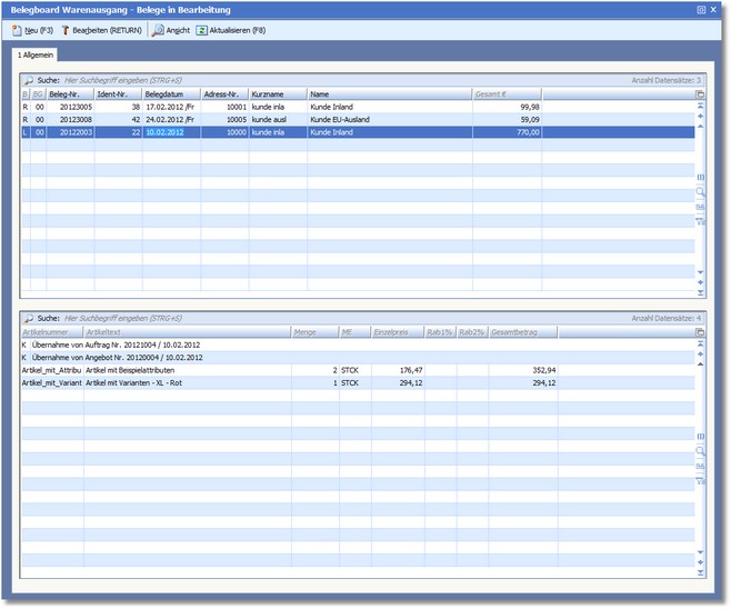 Mit Hilfe des Belegboards können Sie die Belegerfassung mehrfach öffnen und so gleichzeitig verschiedene Belege bearbeiten. Durch mehrfachen Aufruf der Belegerfassung Warenausgang bzw. Wareneingang erfolgt dann automatisch der Start des Belegboards, in dem dann jeweils ein aktuell geöffneter Beleg bearbeitet oder eine neue Belegtabelle gestartet werden kann.