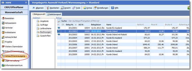 3. Um einen anderen Beleg zu bearbeiten oder erneut einen Beleg anzulegen, ohne den aktuell geöffneten Beleg abzuschließen, öffnen Sie die Belegerfassung erneut (z.B. in der Webware über den Menüpunkt "Favoriten"). Im unten abgebildeten Beispiel klicken Sie hierzu in der Arbeitsplatzleiste auf den Programmpunkt "Verkauf/Warenausgang".