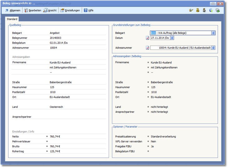 Hier ist die Adressnummer des Quellbelegs eingetragen. Hier können Sie ggf. die Adressnummer für den Zielbeleg ändern. Wählen Sie die gewünschte Adressnummer dazu mit [F5] aus den Adressstammdaten aus.