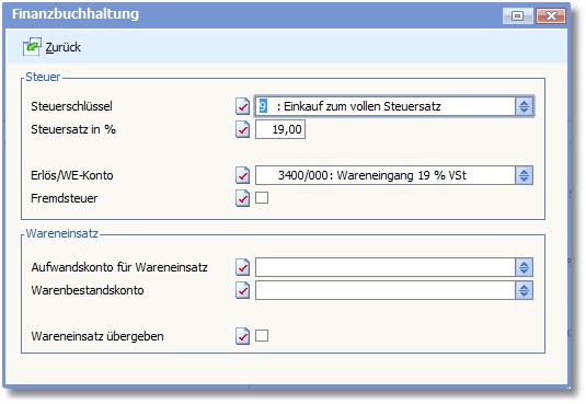 << Hier KLicken um eine Inhaltsübersicht anzuzeigen >> Navigation: Warenwirtschaft > Belegbearbeitung > Einkauf/Wareneingang > Positionserfassung Wareneingang > Details Belegposition > Finanzbuchhaltung |