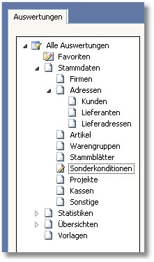 Die Baumauswahl zeigt die einzelnen Auswertungsbereiche. Um einen Bereich zu aktivieren, klicken Sie mit der Maus auf den entsprechenden Ordner.