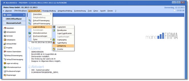 1. Zeigen Sie mit der Maus im Hauptmenü auf "Warenwirtschaft > Lagerverwaltung > Umlagerung".