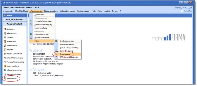 1. Klicken Sie mit der Maus im Hauptmenü auf  "Warenwirtschaft > Extras > Shopmanager"