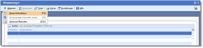 2. Drücken Sie im Shopmanager [F3] oder klicken Sie im Menü auf "Allgemein > Neuer Marketplace".