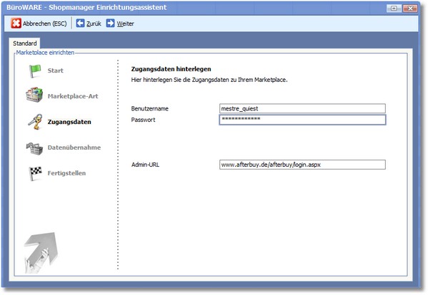 4. Klicken Sie anschließend auf <Weiter> und tragen Sie in die nachfolgende Maske BENUTZERNAME und PASSWORT zum Shop ein.