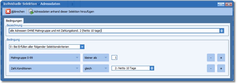 Es sollen alle Adressen in den Selektionspool geladen werden, die keiner Mahngruppe zugewiesen wurden und die Zahlungskondition 2 eingetragen haben.