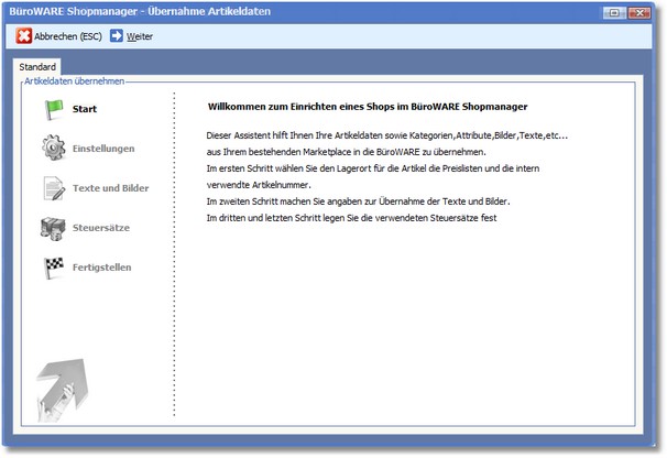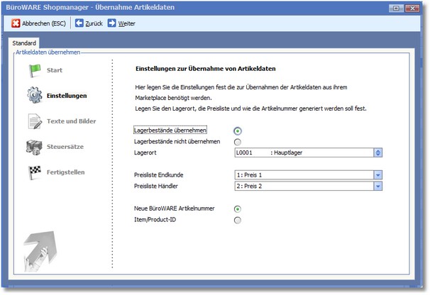 Nachfolgend wird beschrieben, wie bei der Ersteinrichtung des ePages-Marketplaces die Übernahme der Artikeldaten aus dem Shop erfolgt.