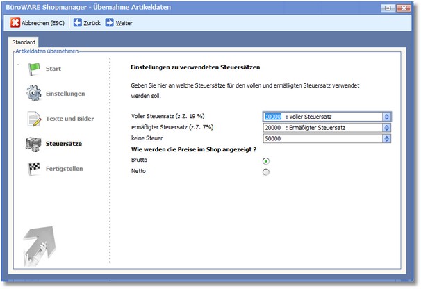Hier werden die Felder für den Steuersatz sowie die Preisanzeige (BRUTTO/NETTO) im Shop vorbelegt. Diese können ebenfalls bei Bedarf geändert werden.