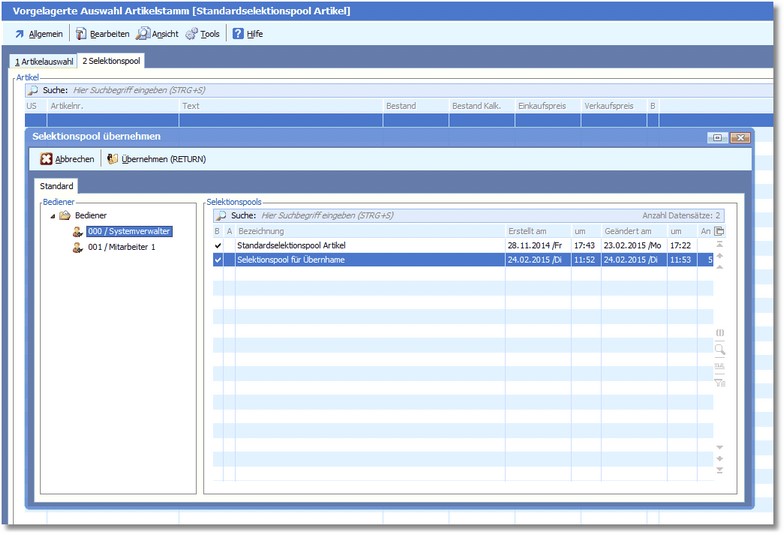 Es wird nun die Auswahl der Bediener und deren gespeicherte Selektionspools geöffnet.
