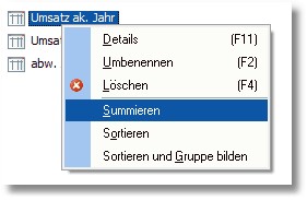 Jedes numerische Feld kann im Selektionspool summiert werden. Dabei braucht man nur mit Rechtsklick auf dem gewünschten Feld (Spalte) das Popup-Menü öffnen und