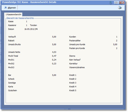 Die Details des Kassiererberichts werden in einem Dialogfenster angezeigt und können mit Klick auf den Quicktoolbutton <Drucken> in Papierform ausgegeben werden.