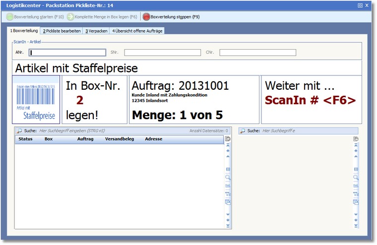 Unterhalb der Artikelnummer wird jeweils die entsprechende Box und die Auftragsdaten sowie die Menge des gescannten Artikels angezeigt.