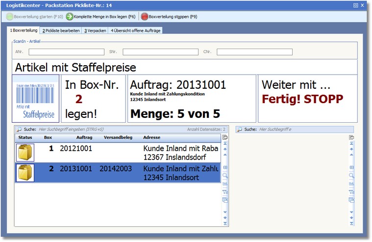 Zunächst werden in der Packstation die Artikel gescannt und auf die Boxen verteilt. In der weiteren Bearbeitung werden im Anschluss die gescannten Artikel verpackt und der Lieferschein ausgedruckt.