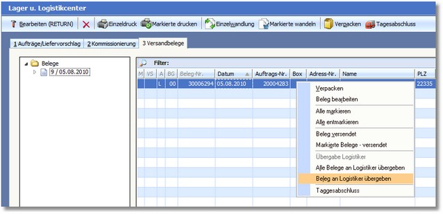 Hierbei wird nur der aktuell markierte Beleg an den Logistiker übergeben.